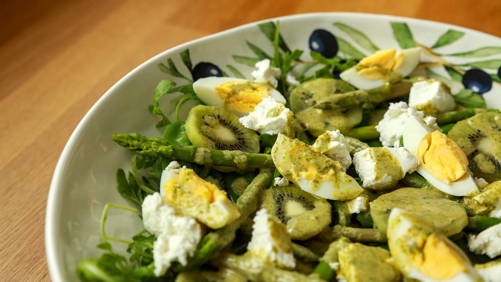 - Serve: Divide the greens mixture onto individual plates. Arrange the kiwi slices, crumbled goat’s cheese, and quartered hard-boiled eggs on top of the greens. Drizzle generously with the Grapefruit Mint Dressing and serve immediately.