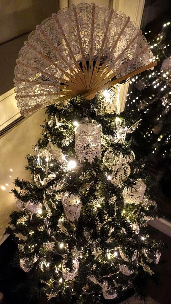 And as a tree topper, I chose something different – a lace fan that stole my heart in that little shop in Bruges. Lace against evergreen. Crystal catching fairy lights.This is my winter wonderland: not loud, not bright, but intricate and true. A tree that asks you to come closer, to notice, to remember that beauty often lives in the smallest, most delicate things.