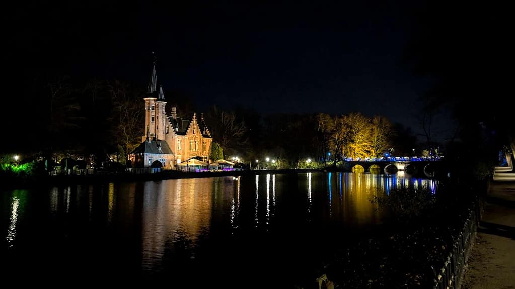 I’m standing at the edge of the Minnewater—the Lake of Love—in Bruges, and the darkness transforms everything. What looks romantic and serene in daylight becomes something else entirely when the sun goes down. The swans disappear into shadow. The trees lean in closer. The water goes black and still. You start to understand why a crime novelist would choose this spot to open a story.