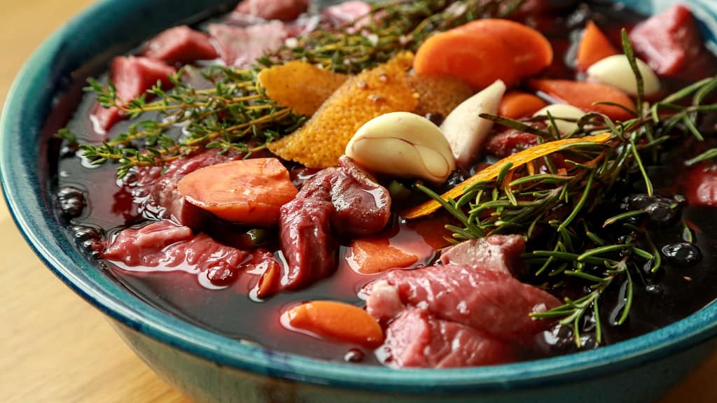 - Marinate the beef: In a large bowl or non-reactive container, combine the beef cubes, chopped onion, carrot, celery, smashed garlic, thyme, rosemary, orange zest, juniper berries, allspice, and carom seeds. Pour the entire bottle of red wine over everything. Stir to ensure the beef is fully submerged. Cover and refrigerate for a minimum of 12 hours, but preferably 24 hours, to allow the flavors to meld.