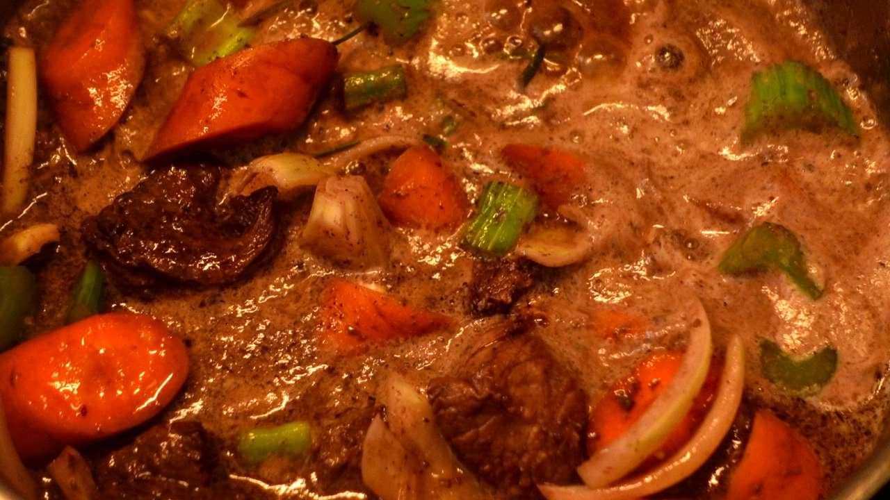 - Sauté vegetables and return beef: Add the reserved marinated vegetables (onion, carrot, celery, etc.) to the pot. Sauté for 5-7 minutes, scraping up any browned bits from the bottom. Return the beef and bacon to the pot.