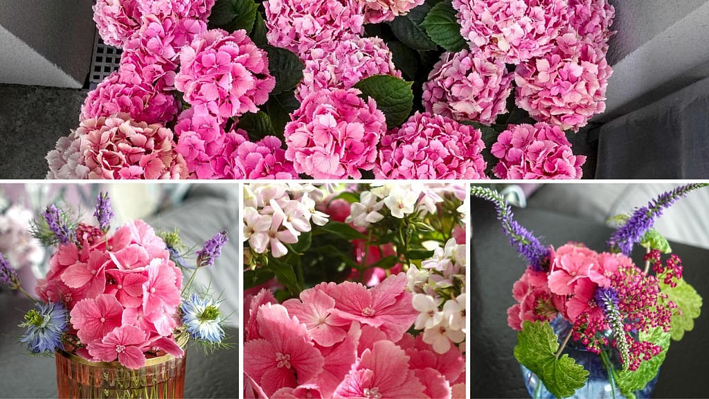 My floral inspiration for July comes from my hydrangea bush that looks like a giant raspberry and cream dessert. This was supposed to be a Dolce France hydrangea, that’s what I bought at least… but looking at the picture, it’s nothing like my dream in pink. Don’t misunderstand me, I’m not the least bit unhappy with what I’ve got, especially since she’s been gifting me these exquisite pink blooms for the past 4 years without fail. So without an official name for her, I decided to call her Hortense – a clin d’oeil to her supposed French heritage. She’s currently the pièce de résistance of all my floral arrangements, and I have a suspicion she’s loving it almost as much as I do !