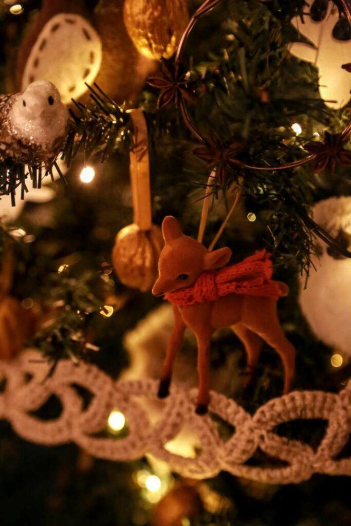 With this rich tradition in mind, I foraged through shops for animal figurines to populate my enchanted forest: deer and owls, foxes and dormice, creatures both humble and dignified. I’ve added natural elements—moss, pinecones, bare branches—to make them feel at home among the boughs. As I mentioned in our first video, Christmas trees as we know them today didn’t exist in medieval celebrations, so I’ve simply adapted the form to suit our theme.