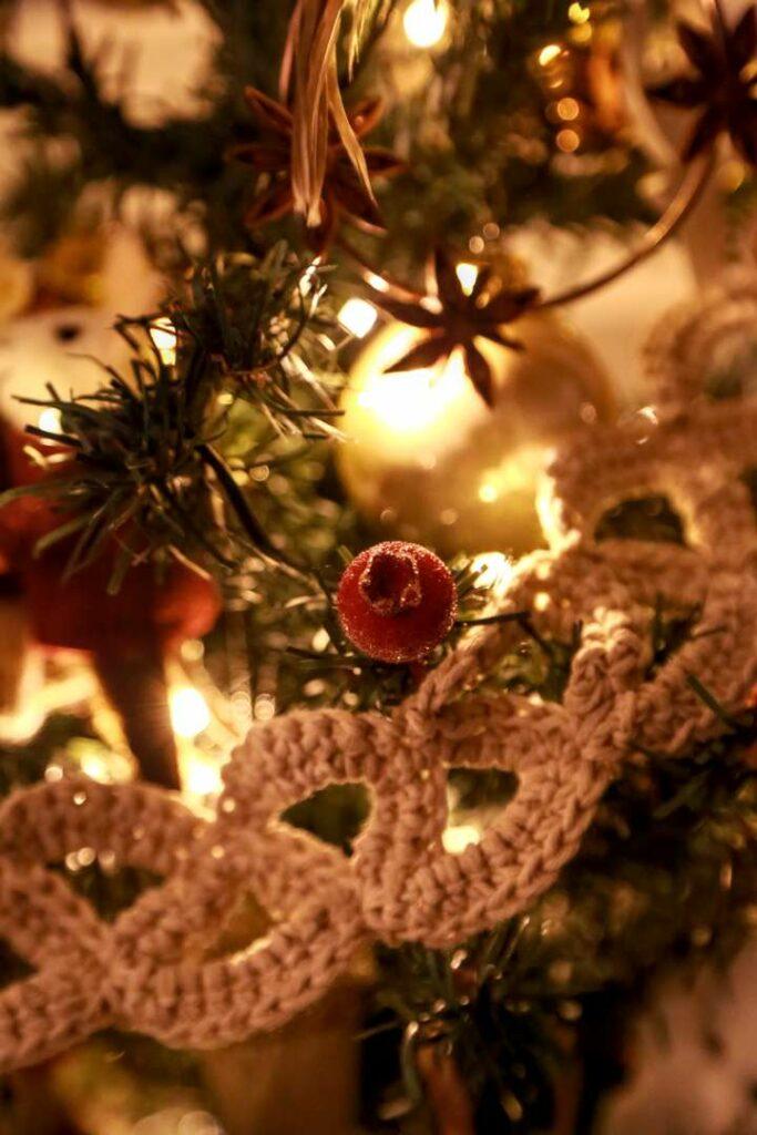 The garland draped through the branches became my winter companion during audiobook listening sessions—a pattern found online (linked below) that somehow captures that artisanal medieval quality. And the fairy lights? Simply squint slightly and they transform into fireflies that have gathered to celebrate the solstice with us. Medieval imagination was nothing if not flexible.