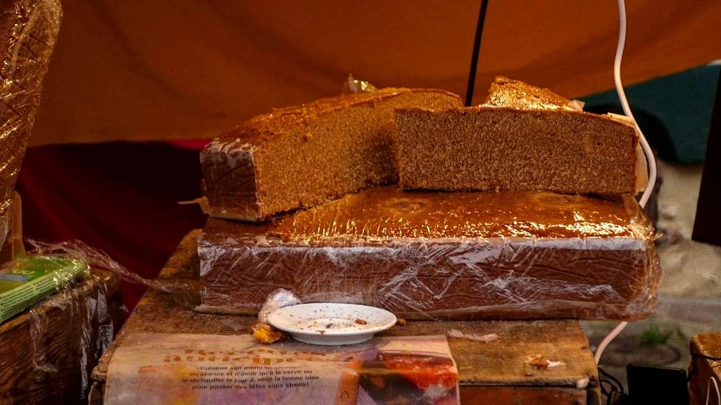 Enormous gingerbread cakes—proper medieval pain d’épices—infused the cold winter air with their warming aromas of cinnamon, cloves, and ginger. Despite a grey and freezing December day, you could feel the joy radiating from people as they passed, their breath visible in the cold air, their faces bright with pleasure and curiosity.