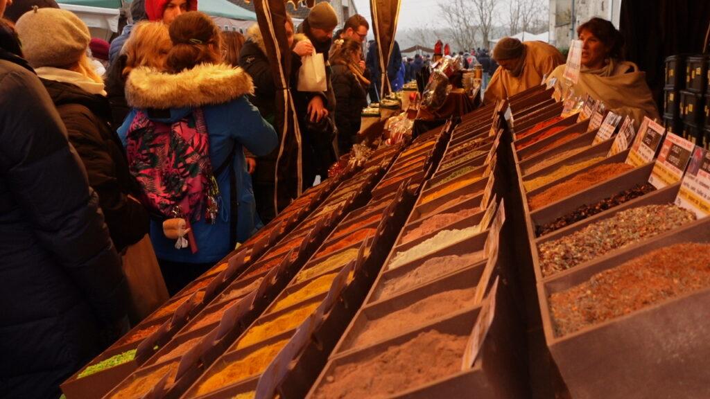 Enormous gingerbread cakes—proper medieval pain d’épices—infused the cold winter air with their warming aromas of cinnamon, cloves, and ginger. Despite a grey and freezing December day, you could feel the joy radiating from people as they passed, their breath visible in the cold air, their faces bright with pleasure and curiosity.