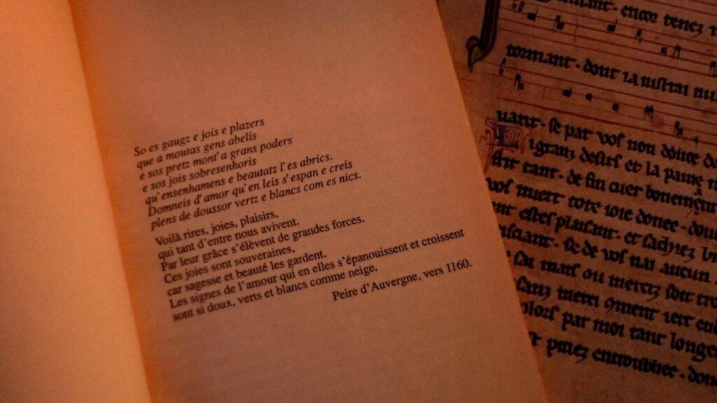 Troubadours were composers and performers of lyrical poetry in the Occitan language during the High Middle Ages, primarily in the eleventh through thirteenth centuries. A brief linguistic reminder: the territory we now call France was divided in medieval times into two distinct regions based on their word for “yes.” The langue d’oc was spoken in the southern territories, also known as Occitanie, while the langue d’oĂŻl dominated the North, with the Loire River serving roughly as the dividing line between them.