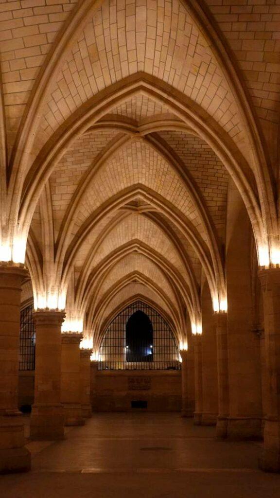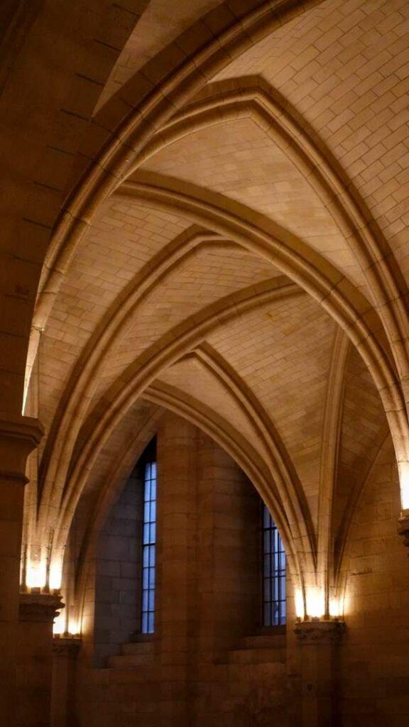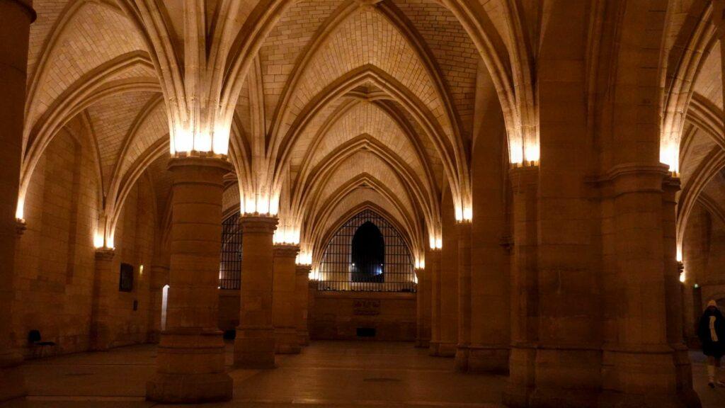 The most impressive surviving space is the Hall of the Men-at-Arms, constructed in the early fourteenth century as a dining hall and gathering place for the guards and servants who worked in the palace—anywhere between one and two thousand souls at the height of the court’s activity. The forest of pillars supporting its vaulted ceiling makes it difficult for the untrained eye to grasp the hall’s true scale, but this is the largest Gothic secular hall in all of Europe. The term “secular” matters here: most surviving medieval spaces of this grandeur are religious—cathedrals, abbey churches, chapter houses. Secular great halls rarely endured.