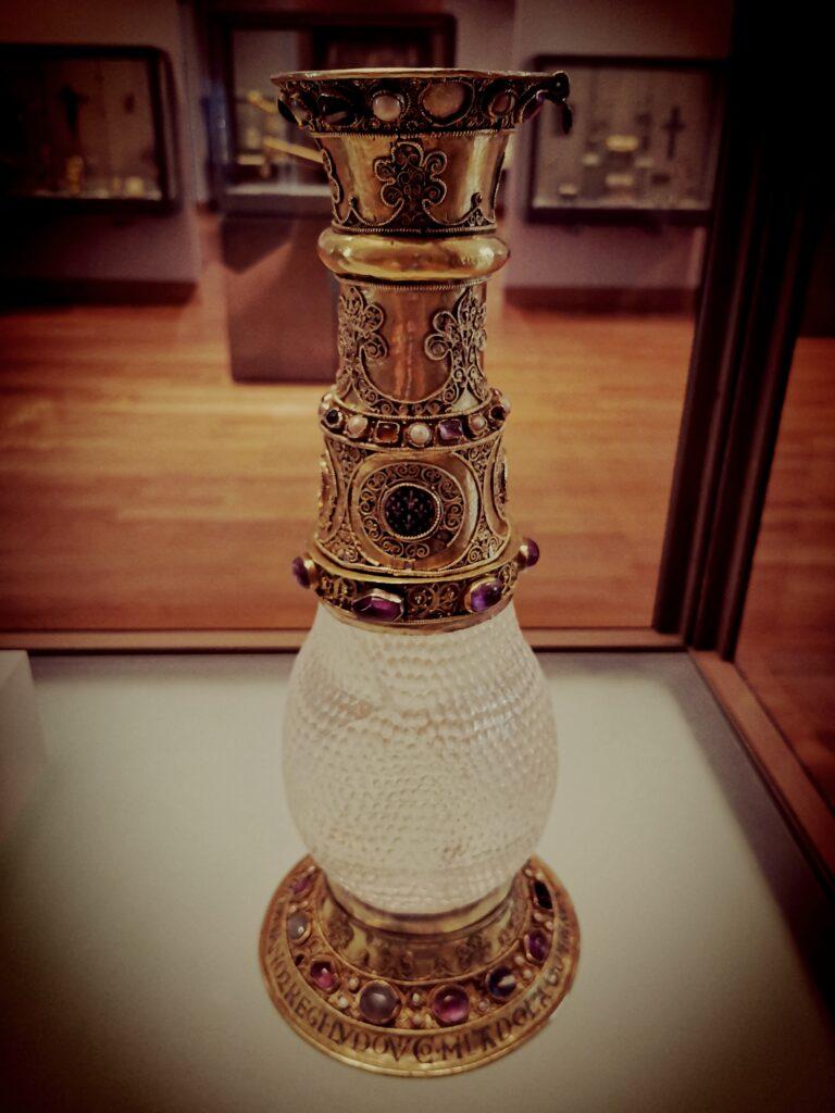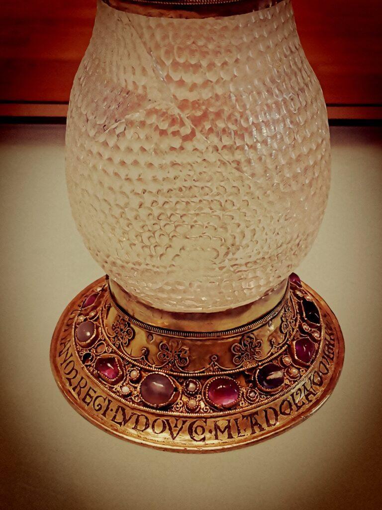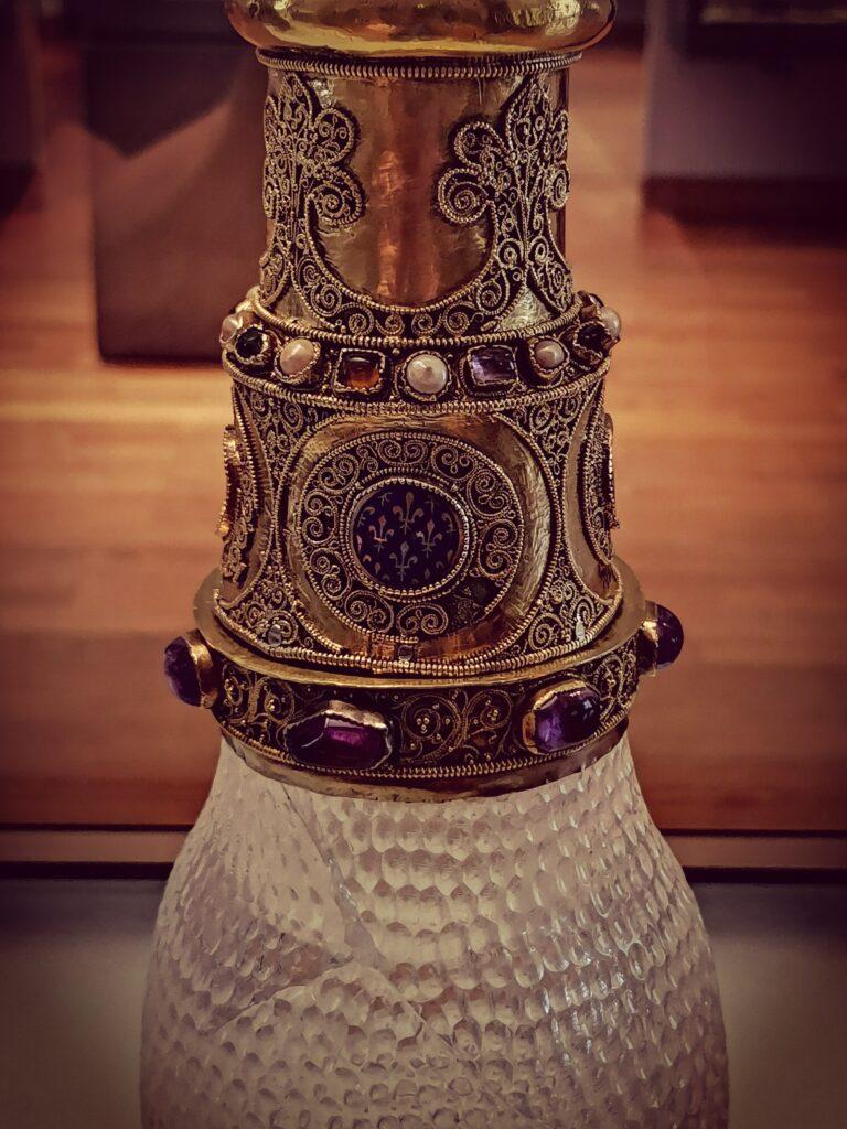 Suger assembled during his lifetime an extraordinary treasury for Saint-Denis, naturally with considerable help from the king. One of the most notable donations Louis VII made to Suger for safekeeping was a gift he himself had received on his wedding day from Eleanor: a clear rock crystal vase with an intricate honeycombed pattern, thought to be of Persian origin. Suger enriched this already precious object with a golden-silver mount studded with gems, transforming it into something even more magnificent.
