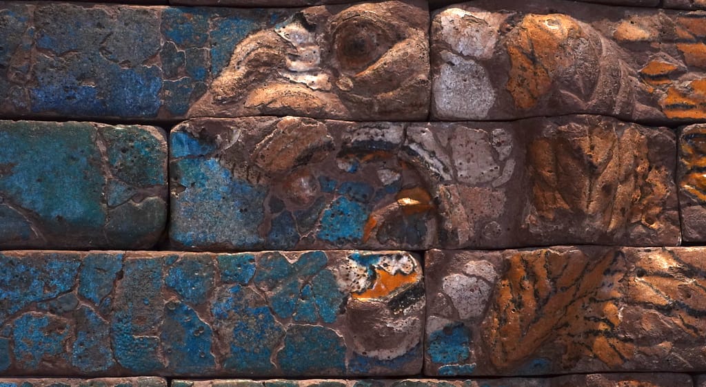 Imagine this : on a scorching summer afternoon, you arrive on the outskirts of Babylon, the main cultural and political city of the area. The year is 500 BC. You make your way towards the eighth gate to the inner city, the Ishtar Gate, built not long ago by the King Nabuchodonosor. The construction stands majestically, in all its dark blue splendour, at the end of a road, the Marduk Processional Way, designed with brick and polychrome images of animals and Gods, each one representing a strong symbol for the Babylonians. The road is almost a kilometer long, so you take a break mid way, to catch your breath, and there, you notice the Lion.