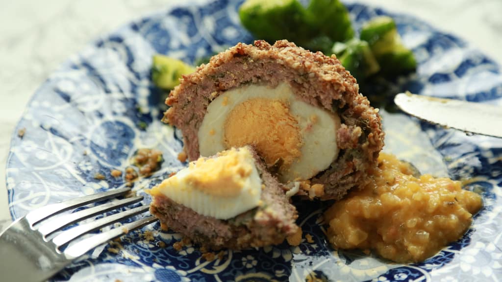 But let’s not forget Miss Pettigrew is a simple woman, with or without her pearls, she must think of lunch. With that in mind, I made one of the most famous English light lunches : a scotch egg. Why scotch ? The explanations vary, but one thing’s for sure : they are not scottish if that’s what you were thinking. A boiled egg, wrapped in sausage meat, and deep fried as tradition would have it, or oven baked if you want a lighter version. Frying it in oil would temporarily seal it, thus making it perfect for travel and eating in on the go. You must try it with a picallily dip (mine was Danish cauliflower picallily, delicious !) and a fresh salad on the side to make it into a meal. Eggs are the quintesential Spring food, and this is such an easy way to make them a bit more special. Not to mention imagining you’re eating this from a posh picnic basket, in a carriage on your way to a Yorkshire estate let’s say. Dream travel through food, my friends !