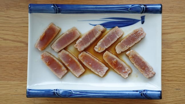 My second course is an all-time favourite and a recent discovery all at once : a tuna tataki with miso glazed eggplant. Now tuna tataki is one of the easiest things you could make, the secret is to never over-cook it, and to make this brilliant sauce of course.I had a rather large tuna steak from the market so I made several strips out of it and grilled it in a very hot non stick pan for 30 seconds on each side. For the sauce, a tiny amount of grated ginger, orange juice, soy sauce, mirin and a drop of sesame oil and you’re done.
