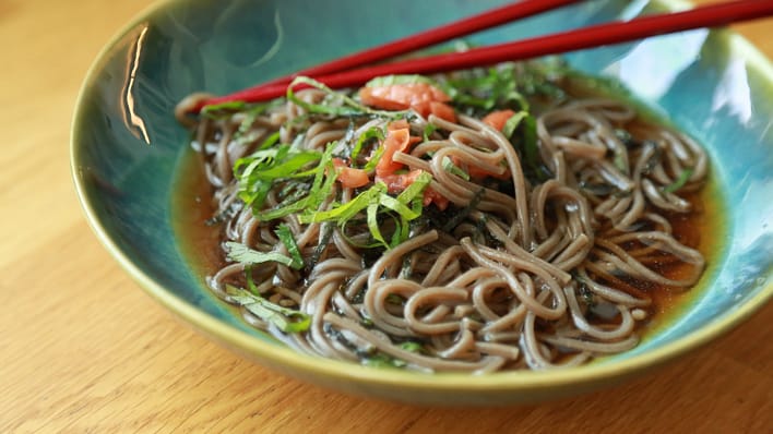 My first course in today’s Japanese menu is a cold soba noodle soup, that I’ve been wanting to make ever since reading Michelle Maisto’s food memoir The gastronomy of marriage, and if you haven’t seen my food memoir video I’ll leave the link here.