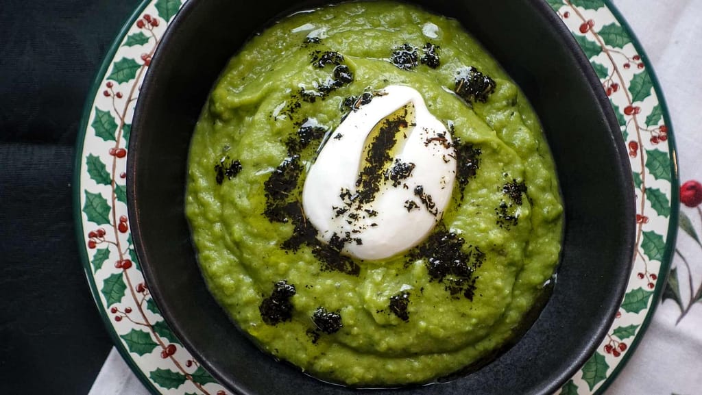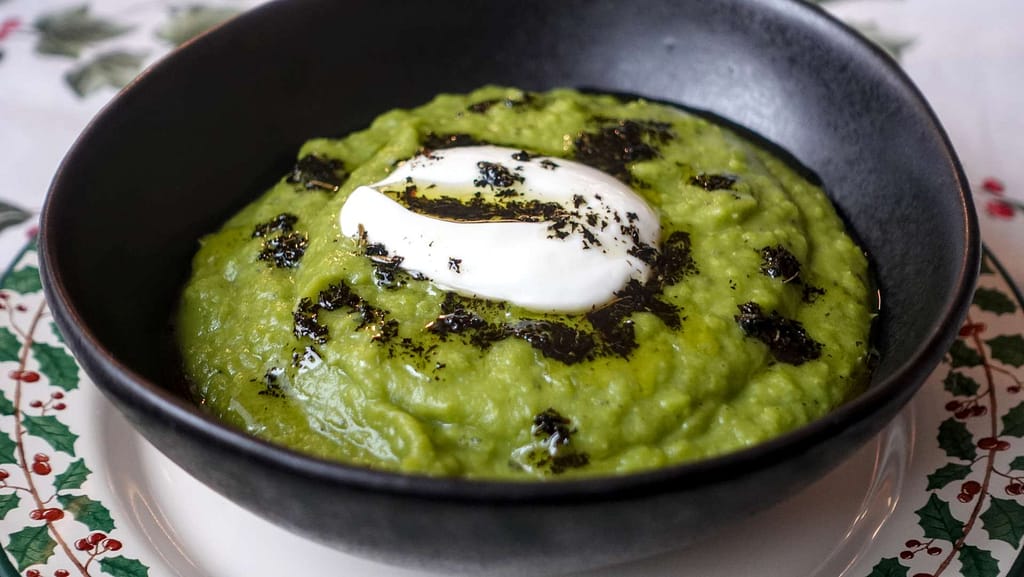 Sweet pea soup might sound simple, but there’s an alchemy to it when it’s done right. The sweetness of the peas, the richness of good homemade stock, the way it warms you from the inside out—it’s comfort in a bowl. My version stays true to what I imagine Germaine’s would have been: nothing overly complicated, just honest ingredients treated with respect. The secret is in the chicken stock I make from scratch, simmered low and slow until it’s golden and full of flavor. And the real gem, the thing that elevates it from simple to special, is the fried mint olive oil I drizzle on top just before serving. That bright, aromatic hit against the earthy sweetness of the peas—it’s the kind of small touch that turns a humble soup into something you’ll remember, the kind of dish that deserves to become your own Christmas Eve tradition.