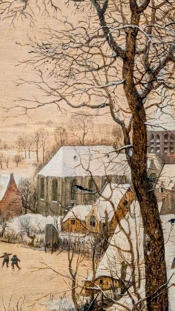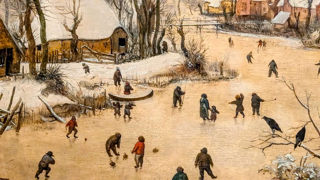 Because when I look at it, I recognise my childhood. More than four centuries divide his winter from mine, and yet the spirit is unchanged: that same worry-free joy of a snow day on the lake, of nothing more pressing or more important to do than celebrate being alive in the dead of winter. When everything is frozen yet the blood runs warm, flushing the cheeks of joyous children, and offering parents a reminder of the beauty that lies beneath the hardship of winter. This painting is calm and joyful at the same time; it’s the cosiness of warm fireplaces you can imagine inside each home, and the exuberance of winter games outdoors. The bird trap adds its own quiet truth: sometimes the birds get away with their feast; sometimes humans claim their meal. Life is always a negotiation between the two.