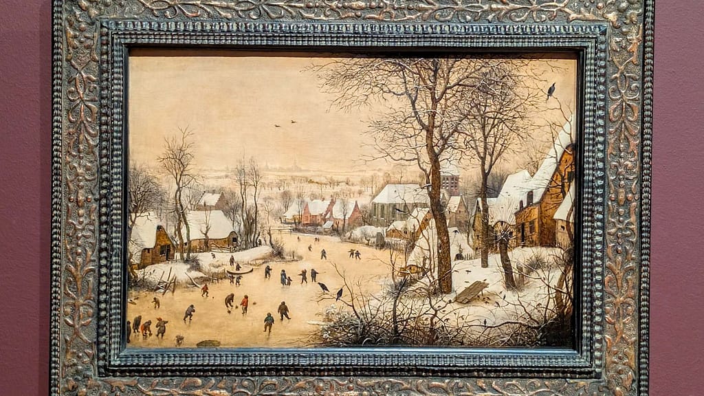 At first glance, it seems simple—almost modest in size compared to the grand canvases nearby. A frozen river. Children skimming across the ice. A village tucked beneath the snow. Bare trees stretching like delicate calligraphy against the sky.
